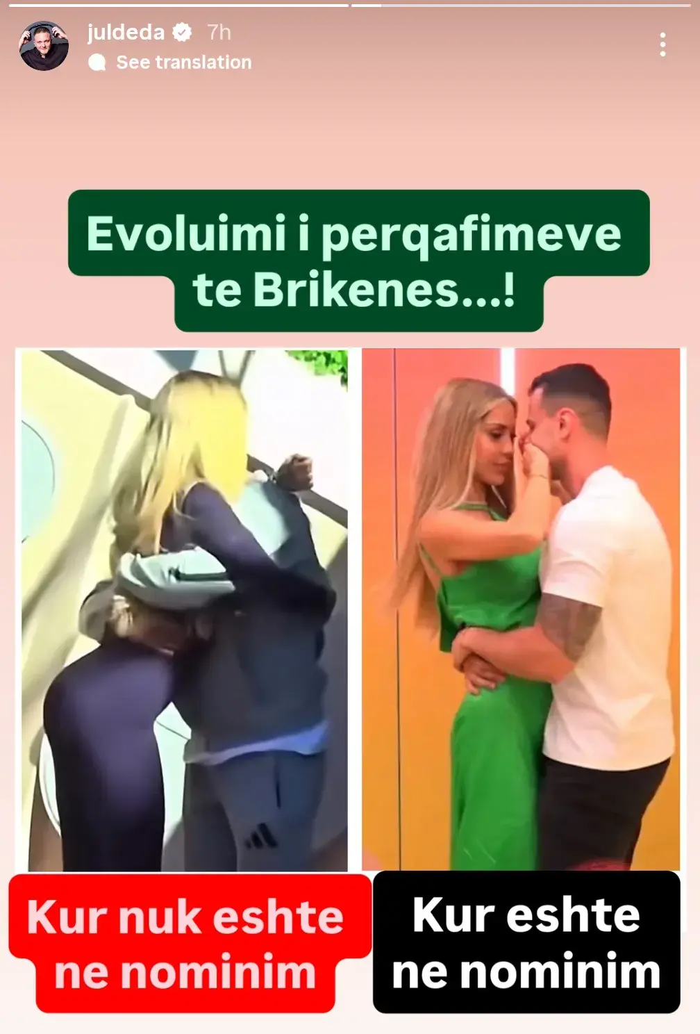 Në njërën anë të fotos, ai ka vendosur një moment ku Brikena jep një përqafim shumë të ftohtë dhe në distancë, shoqëruar me tekstin: “Kur nuk është në nominim”.