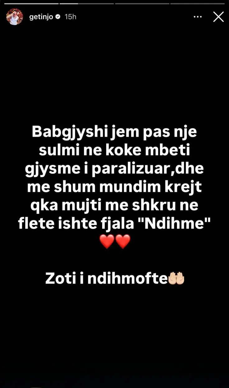 Getinjo, në një postim emocional, ka ndarë detaje rreth gjendjes shëndetësore të gjyshit, duke theksuar se pas sulmit, ai ka mbetur gjysmë i paralizuar.