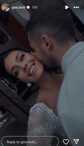 Në një postim të fundit në rrjetet sociale, Gresa shihet e veshur me një fustan nusërie të mrekullueshëm, duke shkëmbyer puthje me partnerin e saj.