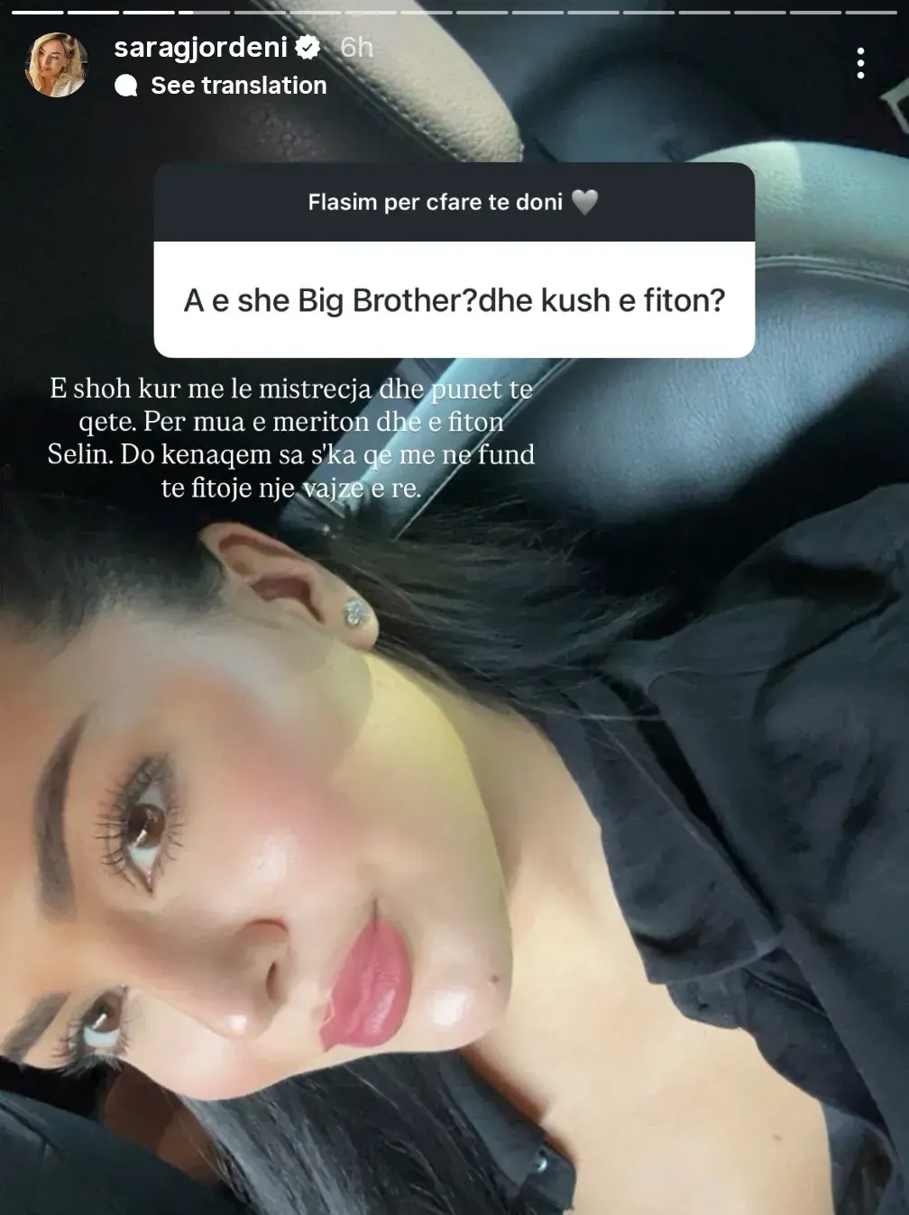 “Për mua e meriton dhe e fiton Selin. Do kënaqem sa s’ka që më në fund të fitojë një vajzë e re,” ka shtuar ajo në postimin e saj në InstaStory.