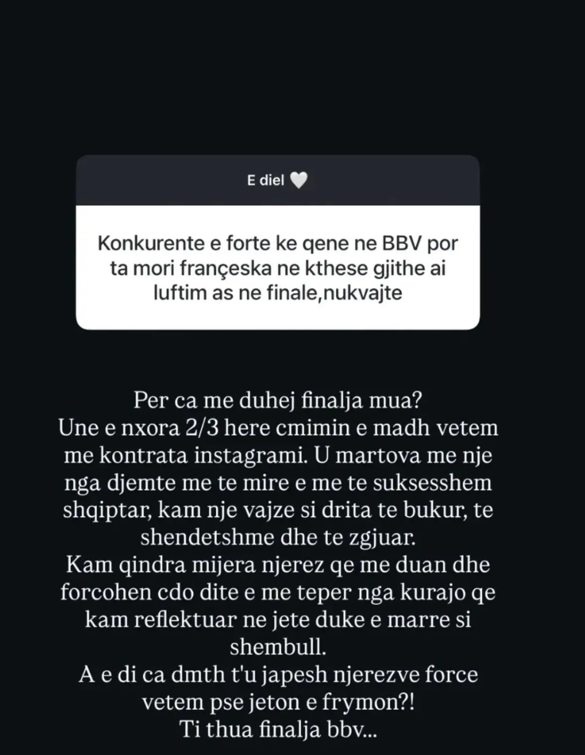 “Për çfarë më duhej finalja mua? Unë e nxora 2-3 herë çmimin e madh vetëm me kontrata Instagrami,” shkroi ajo, duke lënë të kuptohet se popullariteti i saj ka sjellë përfitime të mëdha financiare.