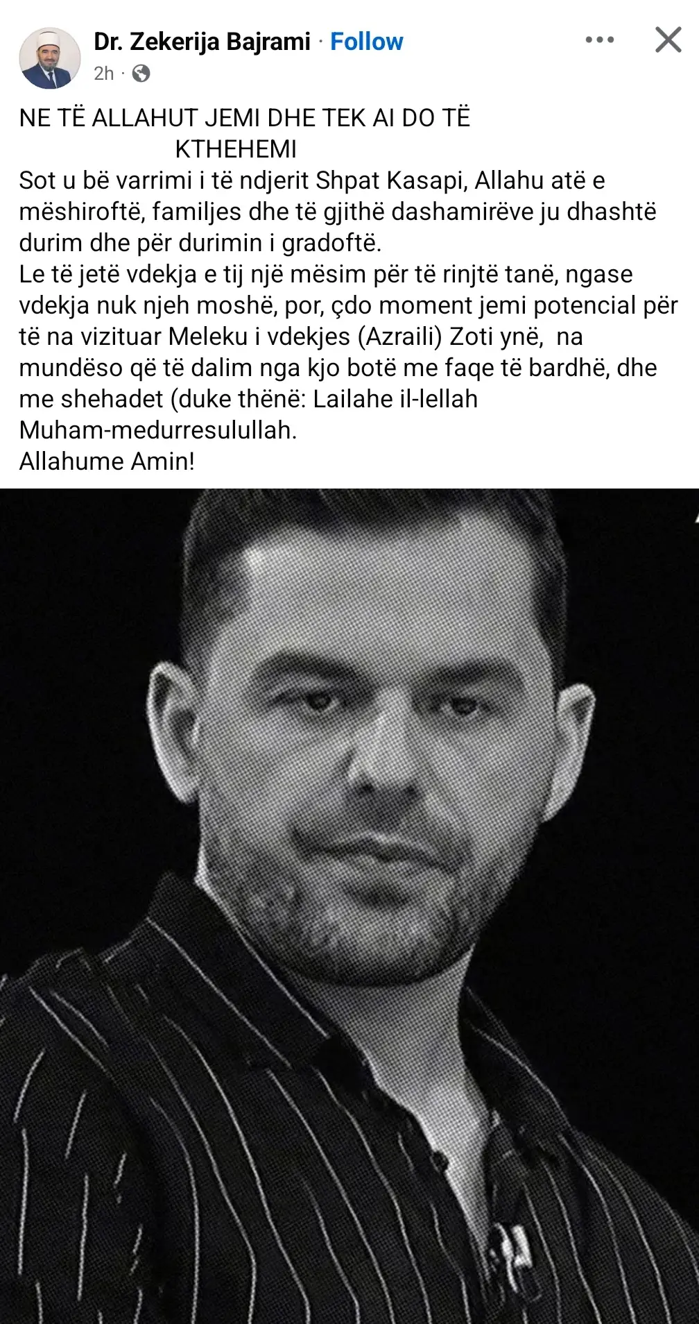 “Sot u bë varrimi i të ndjerit Shpat Kasapi, Allahu atë e mëshiroftë, familjes dhe të gjithë dashamirëve ju dhashtë durim dhe për durimin i gradoftë.”