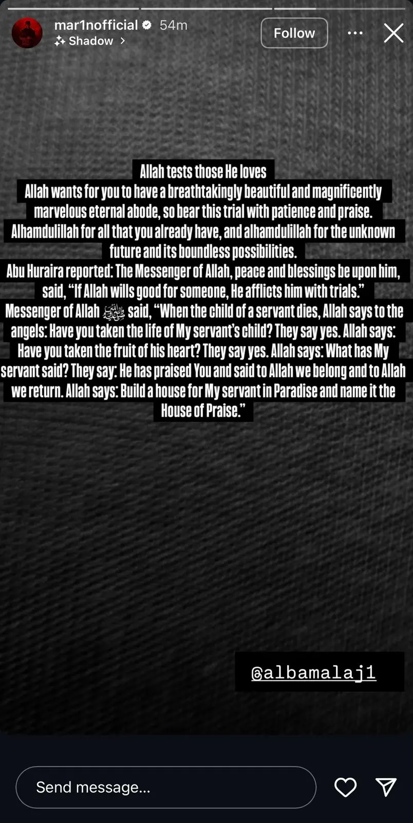 Në një postim të fundit në Instagram, Marin ka ndarë disa fjalë të thella që flasin për besimin dhe durimin në përballjen me vështirësitë. Ai ka ndarë një citat të fuqishëm që thekson se Allahu i sprovon ata që i do, duke i dhënë atyre mundësinë për të përjetuar një vendbanim të përjetshëm në xhenet.