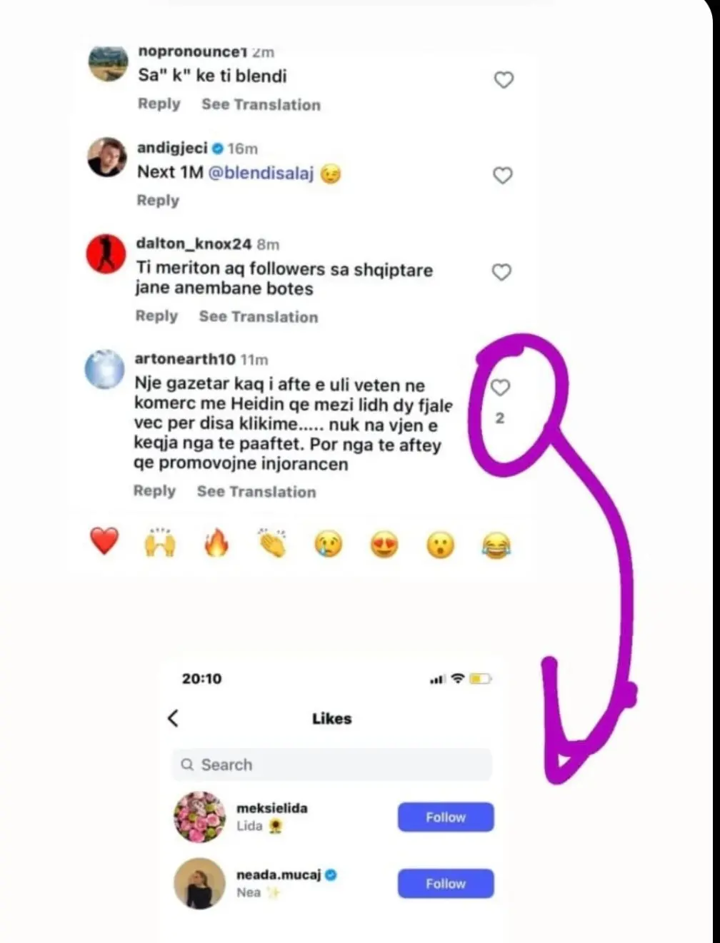 “Një gazetar kaq i aftë e uli veten në komerc me Heidin që mezi lidh dy fjalë… nuk na vjen e keqja nga të paaftët, por nga të aftët që promovojnë injorancën,” shkruhej në koment.