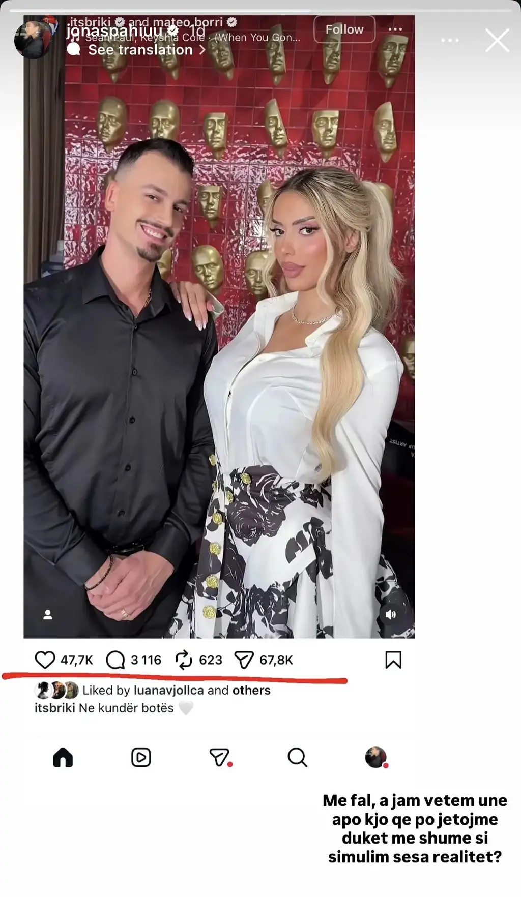 Një postim i fundit në rrjete sociale nga Mateo Borri dhe Brikena Selmanaj, dy ish banoret e Big Brother VIP Albania, ka tërhequr vëmendje jo vetëm për pozën e tyre, por edhe për shifrat e larta të ndërveprimeve.