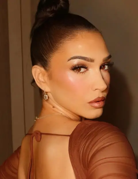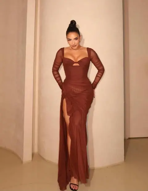 Me një fustan unik në nuanca kafe, ajo u shfaq tejet glamuroze. Prerja e guximshme me çarjen anësore theksoi linjat e saj trupore, duke i dhënë një pamje tërheqëse dhe të sofistikuar.