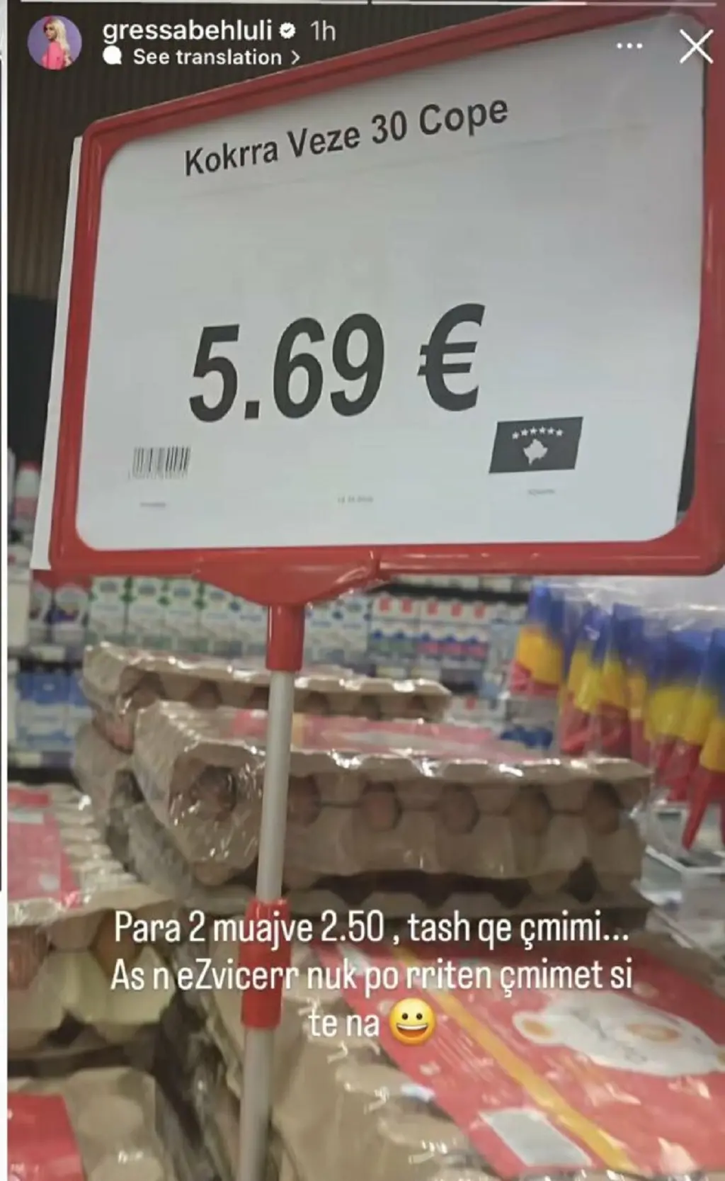 “Para 2 muajve 2.50, tash që çmimi as në Zvicër nuk po rriten çmimet sit e na”, ka shkruar ajo.