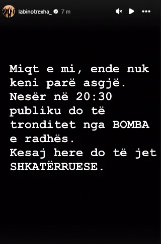 Me një postim intrigues në InstaStory, ai ka shkruar: “Miqt e mi, ende nuk keni parë asgjë. Nesër në 20:30 publiku do të tronditet nga BO.MBA e radhës. Kësaj here do të jetë SHKATËRRUESE.”