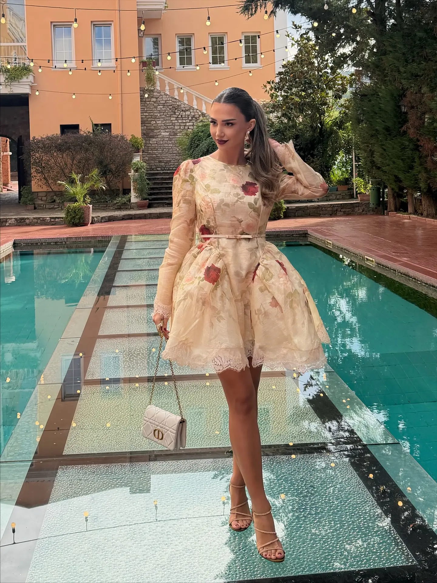 Në këtë imazh, Kiara duket njësoj sikur ka dalë nga një përrallë, duke mbajtur veshur një fustan elegant me motive lulesh, që të kujton delikatesën e koheve të artë.