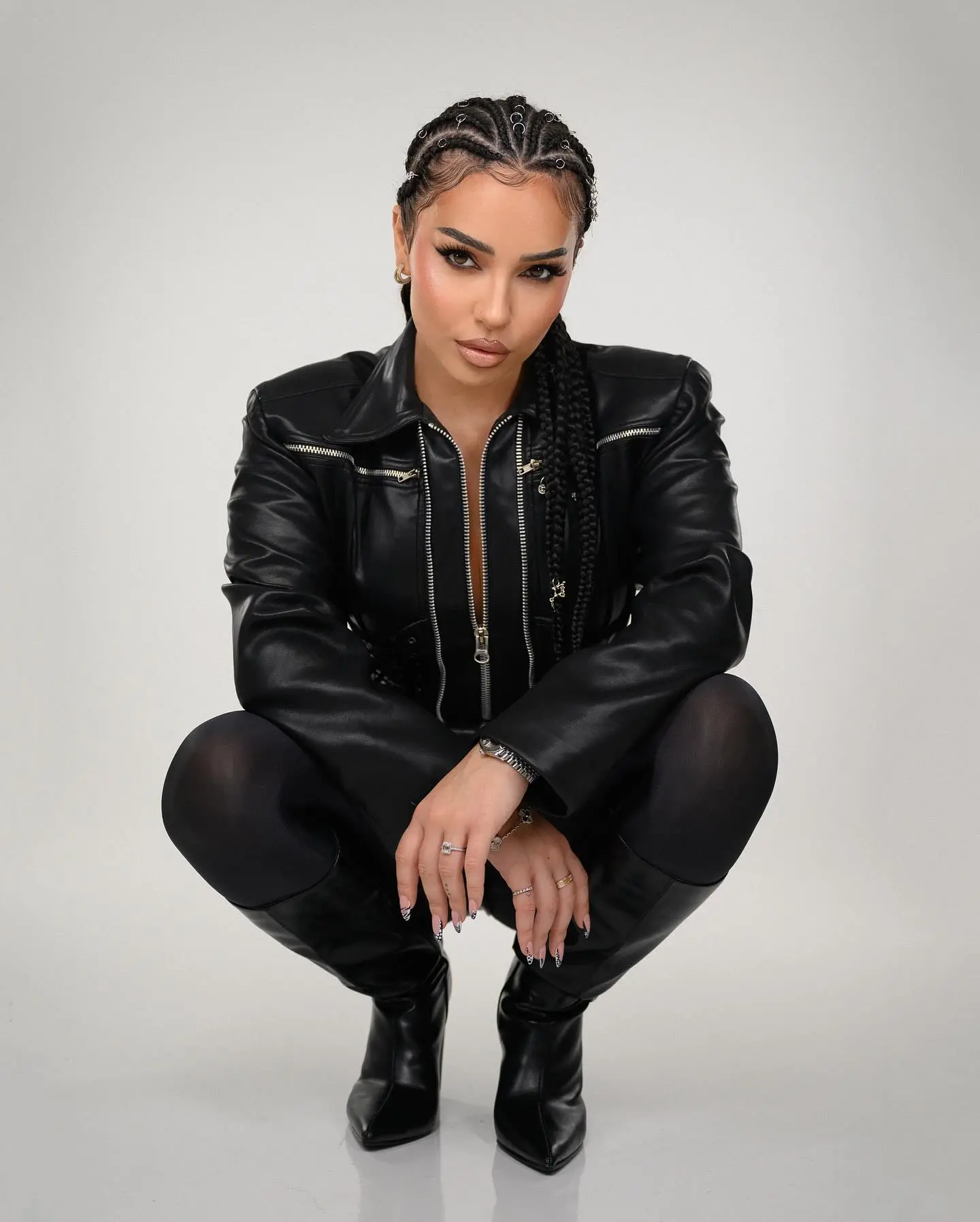 Veshur me një xhaketë lëkure dhe flokë të gërshetuara, ajo tregon se si mund të jesh në hap me modën dhe të frymëzosh të tjerët.
