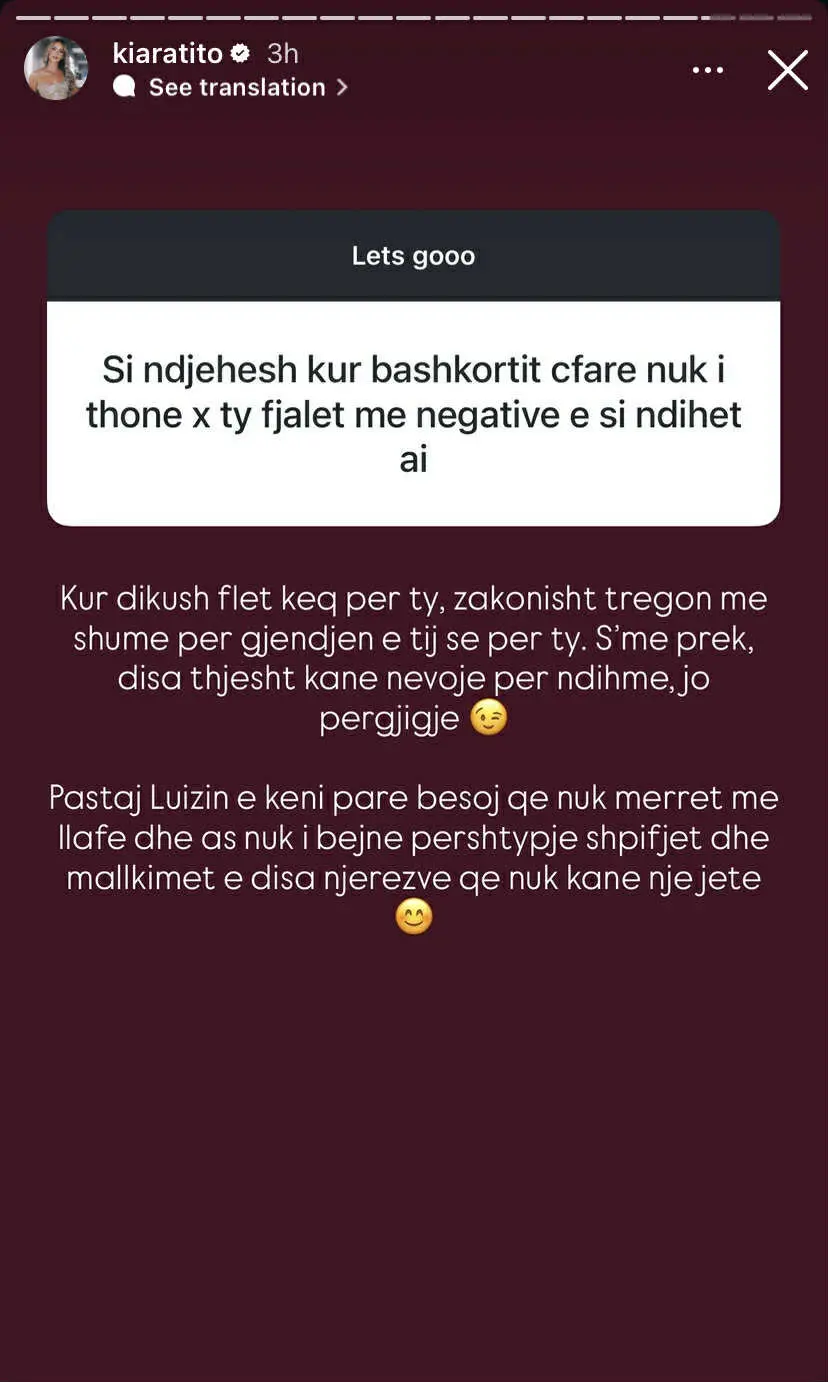 “Pastaj Luizin e keni parë besoj që nuk merret me llafe dhe as nuk i bëjnë përshtypje shpifjet dhe mallkimet e disa njerëzve që nuk kanë një jetë,” shtoi ajo, duke dërguar një mesazh të fortë për ata që përpiqen të përfshijnë çiftin në debate negative.