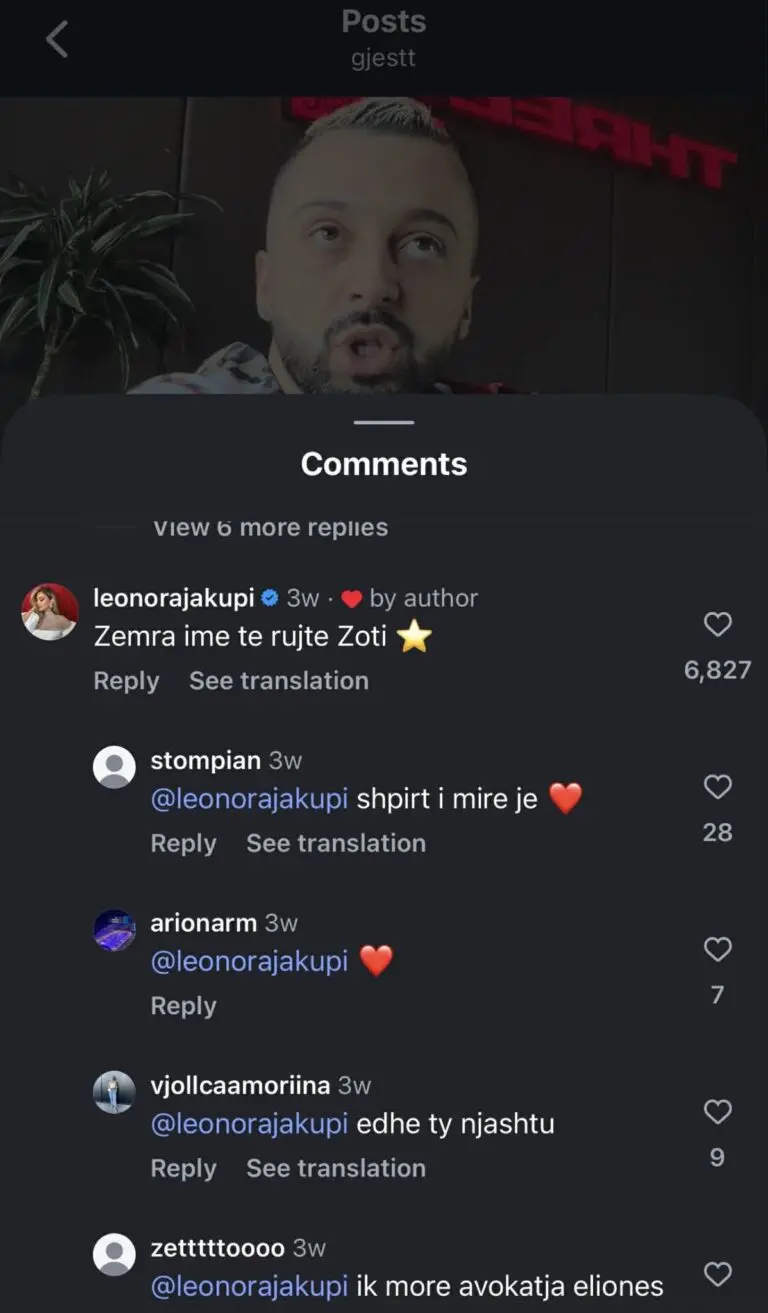 “Zemra ime të rujtë Zoti”, ka shkruar Leonora në postimin e saj, duke theksuar lidhjen e veçantë që ndan me Gjestin dhe admirimin e saj për talentin e tij.