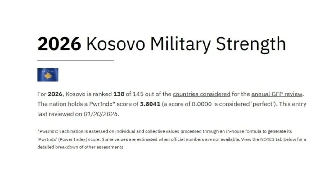 Ku renditet Kosova në këtë skenar? Në renditjen e vitit 2026, Kosova është renditur e 138-ta me një indeks fuqie ushtarake prej 3.8041. Kjo tregon një përmirësim të dukshëm në krahasim me vitin e kaluar.