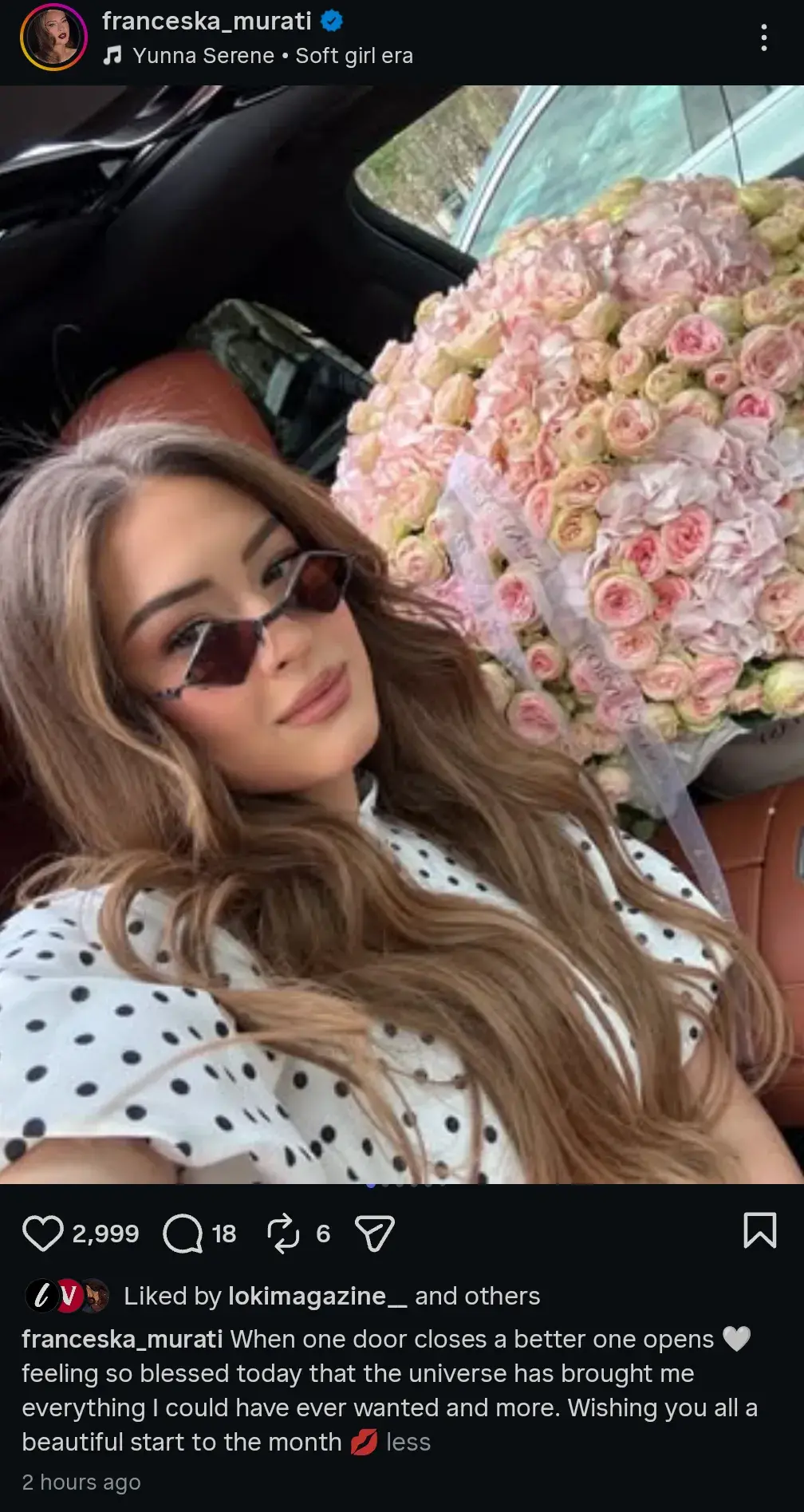 Me fillimin e muajit shkurt, Françeska ka ndarë disa fotografi ku shfaqet e buzëqeshur në makinë, ndërsa pranë saj ndodhet një buqetë e madhe me trëndafila rozë.