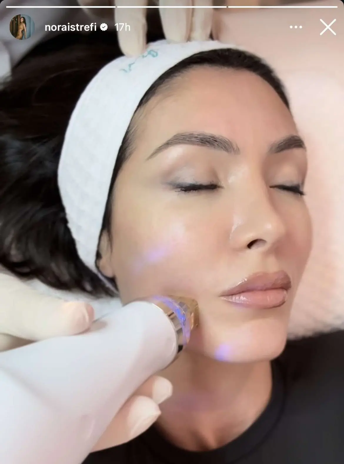 Në videon e postuar, Nora shihet gjatë procesit të trajtimit, ndërsa fytyra i ekspozohet pajisjes së lazerit.