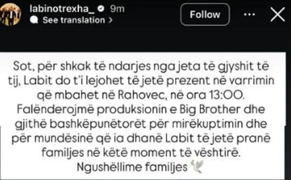 Falënderojmë produksionin e Big Brother dhe gjithë bashkëpunëtorët për mirëkuptimin dhe mundësinë që ia dhanë Labit të jetë pranë familjes në këtë moment të vështirë”, thuhet në njoftim.
