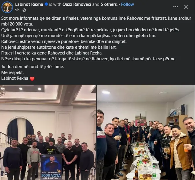 “Sot mora informata që në ditën e finales vetëm nga komuna ime Rahovec me fshatrat kanë ardhur mbi 20.000 vota,” shkruan ai, duke e bërë të qartë se popullariteti i tij është i lidhur ngushtë me qytetin që përfaqëson.