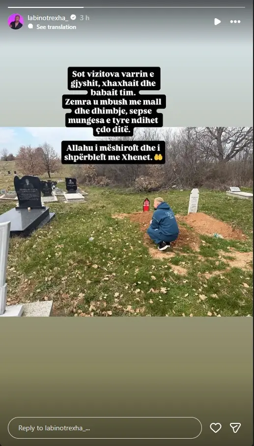 Zemra u mbush me mall dhe dhimbje, sepse mungesa e tyre ndihet çdo ditë. Allahu i mëshiroftë dhe i shpërbleftë me xhenet,” shkroi Rexha në postimin e tij në InstaStory, duke shprehur ndjenjat e tij më të thella.