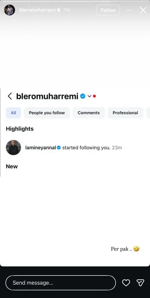 Postimi i tij përmbante një imazh që sugjeronte se ylli i ri i FC Barcelona, Lamine Yamal, kishte filluar ta ndiqte atë në rrjetet sociale.