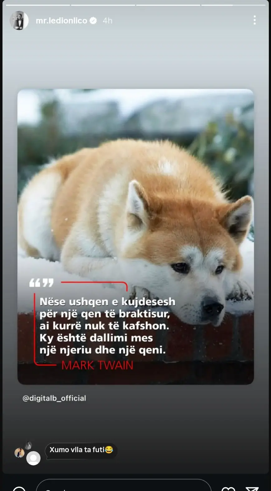 Pas këtij thumbi, Ledion Liço ka zgjedhur të reagojë në një mënyrë të veçantë. Ai ka shpërndarë një fotografi në InstaStory me një thënie të shkrimtarit të njohur Mark Twain, e cila duket se është një përgjigje e qartë ndaj situatës së krijuar.