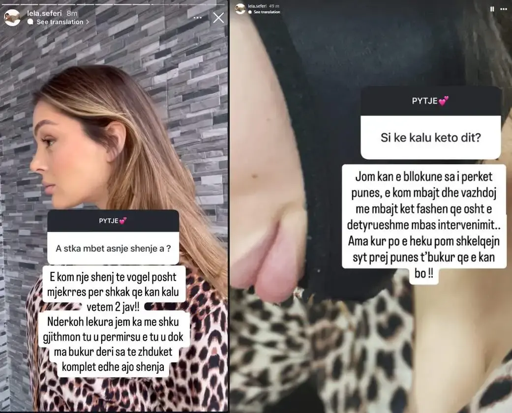 “Kam qenë e bllokuar sa i përket punës, e kam mbajtur dhe vazhdoj të mbaj këtë fashë që është e detyrueshme pas intervenimit,” ka shkruar Lela në Instagram, duke ndarë një foto ku shfaqet me fashën kompresuese rreth kokës. Kjo tregon angazhimin e saj për të përfunduar me sukses këtë proces transformimi.