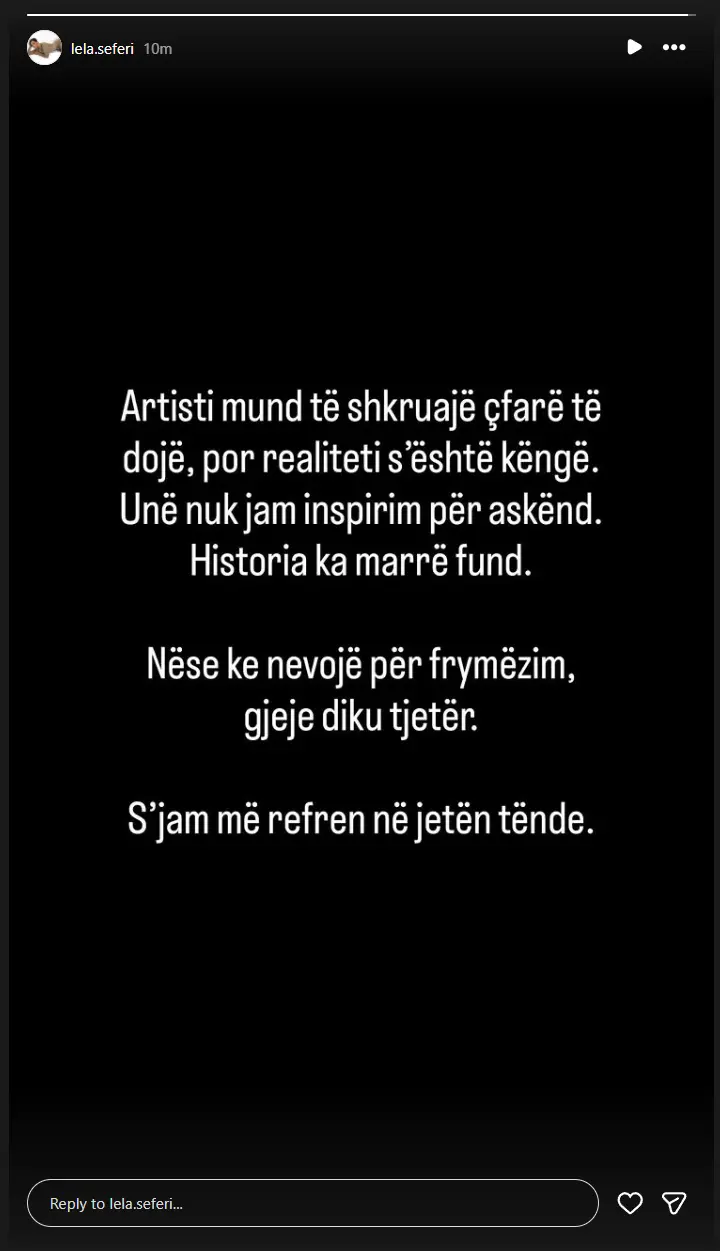 Në një Instastory, Lela shprehet: “Artisti mund të shkruajë çfarë të dojë, por realiteti s’është këngë. Unë nuk jam inspirim për askënd. Historia ka marrë fund. Nëse ke nevojë për frymëzim, gjeje diku tjetër. S’jam më refren në jetën tënde.” Kjo deklaratë e saj ka shkaktuar një valë reagimesh në rrjetet sociale.