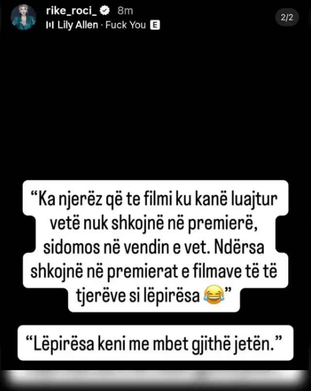 Pak më vonë, Rike Roçi reagoi në InstaStory me një mesazh të ashpër, pa përmendur emra, por që ishte e qartë se ishte një thumbim për Meritonin, duke theksuar se disa individë nuk e respektojnë punën e tyre.