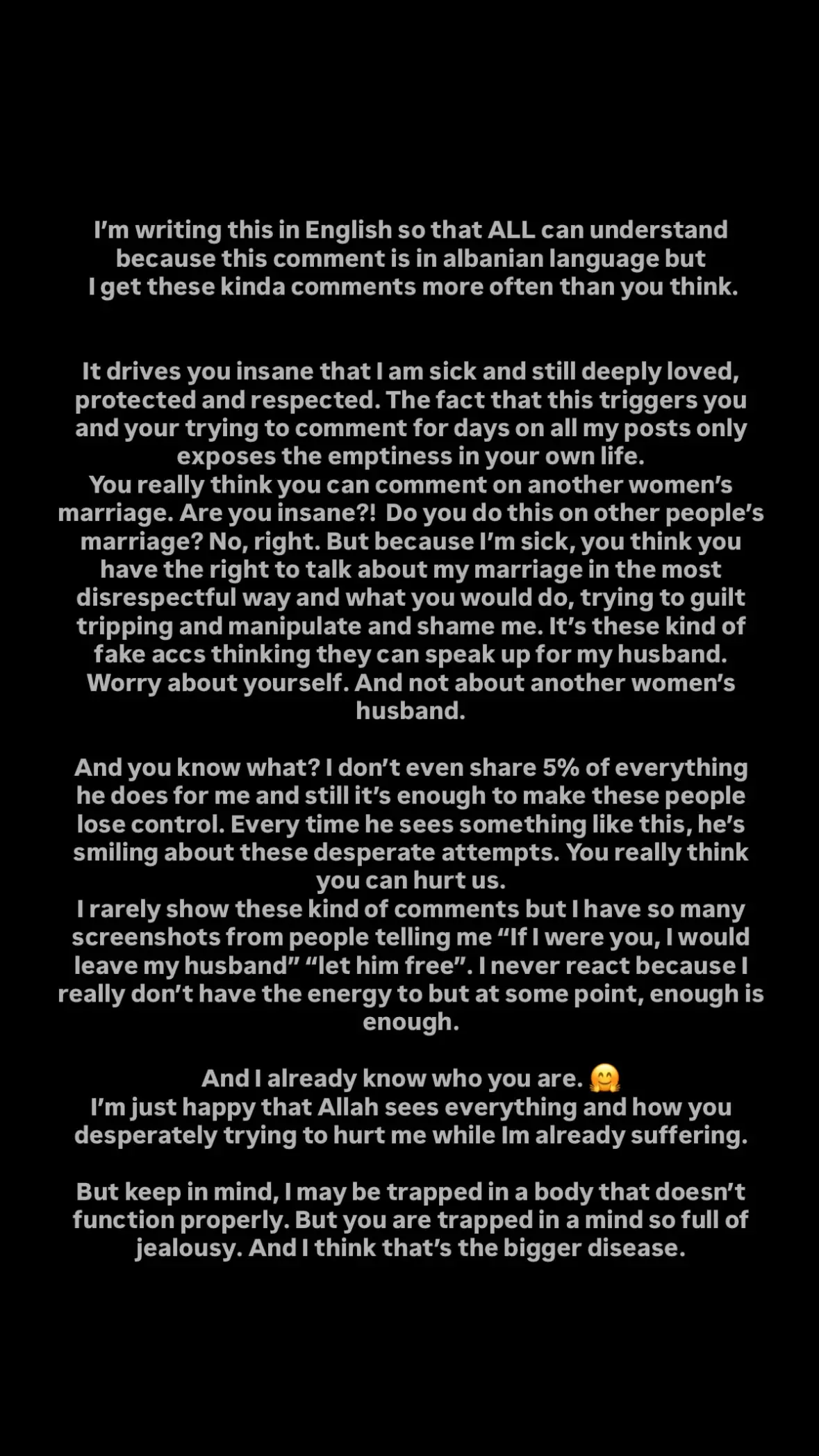 Reagimi i saj përfundoi me një mesazh të fuqishëm për ata që e sulmojnë: “Mbajeni mend: Unë mund të jem e bllokuar në një trup që nuk funksionon siç duhet.