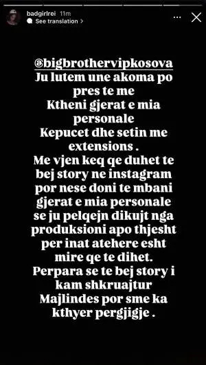 Postimi i saj është i drejtpërdrejtë dhe i qartë: “@bigbrothervipkosova ju lutem, unë akoma po pres të më ktheni gjërat e mia personale, këpucët dhe setin me extensions. Më vjen keq që duhet të bëj story në Instagram, por nëse doni t’i mbani gjërat e mia personale sepse nuk i pëlqejnë dikujt nga produksioni, atëherë është mirë të dihet,” shkruan ajo.