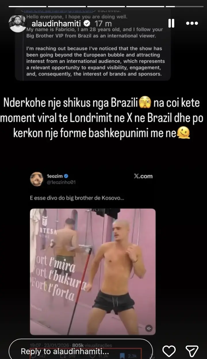 Fabricio, një ndjekës i njohur nga Brazili, ka kontaktuar Alaudinin për t’i treguar se si një moment i veçantë i Londrimit ka pushtuar rrjetin social “X” në vendin e tij, duke krijuar një valë reagimesh dhe komentesh.