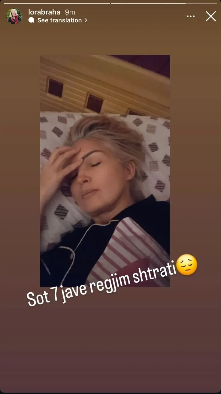 Në postimin e saj, Lora shfaqet e shtrirë në krevat, me dorën në ballë, duke shprehur dhimbjen e saj përmes një emoji të trishtuar.