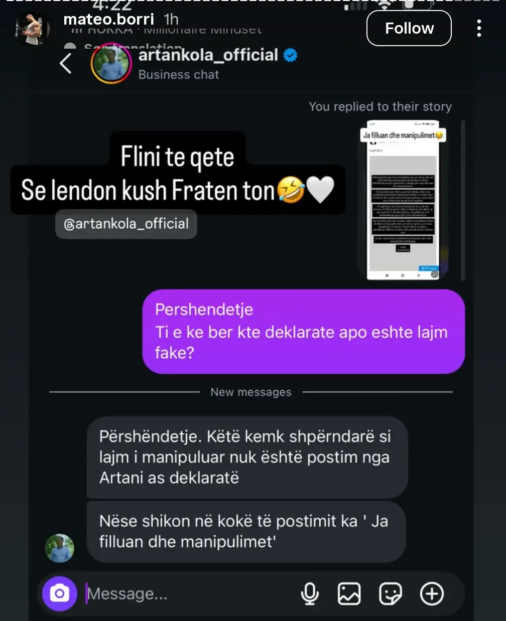 Për të zbuluar të vërtetën pas këtij lajmi shqetësues, familjarët që menaxhojnë llogarinë e Mateos në Instagram nuk kanë humbur kohë dhe kanë kontaktuar drejtpërdrejt me Artanin.