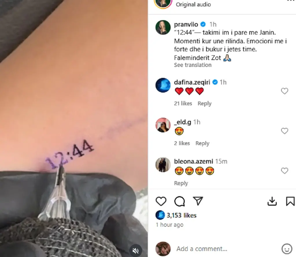 Pranvera, e cila është bërë nënë për herë të parë, ka vendosur të bëjë një tatuazh që përfaqëson momentin e lindjes së djalit të saj. Ajo ka zgjedhur të shënojë në trup orën e saktë kur Jani ka ardhur në jetë, një veprim që tregon se sa shumë e vlerëson këtë përvojë të jashtëzakonshme.