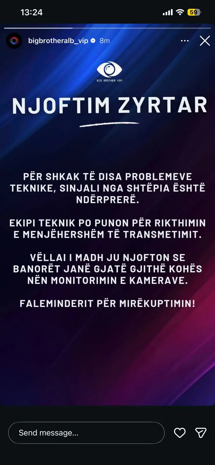 “Për shkak të disa problemeve teknike, sinjali nga shtëpia është ndërprerë. Ekipi teknik po punon për rikthimin e menjëhershëm të transmetimit.”
