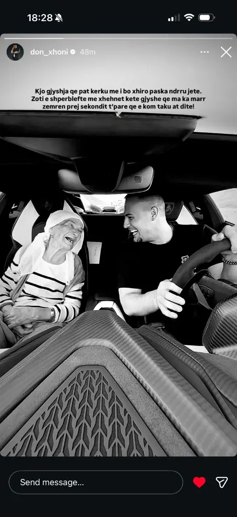 Zoti e shpërbleftë me Xhehnet këtë gjyshe që ma ka marrë zemrën prej sekondit t’parë që e kom taku at ditë,” – shkroi ai, duke e shoqëruar mesazhin me një foto bardhë e zi nga momenti i tyre i paharrueshëm në makinë.