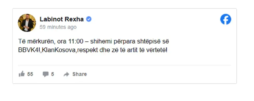 “Të mërkurën, ora 11:00 – shihemi përpara shtëpisë së BBVK4, Klan Kosova, respekt dhe zë të artit të vërtetë!”