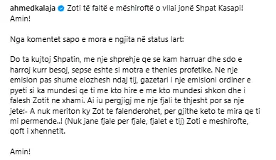 Kalaja e përfundoi postimin e tij me një lutje të sinqertë, duke shprehur dëshirën që Shpati të gjejë paqe në jetën e përtejme.