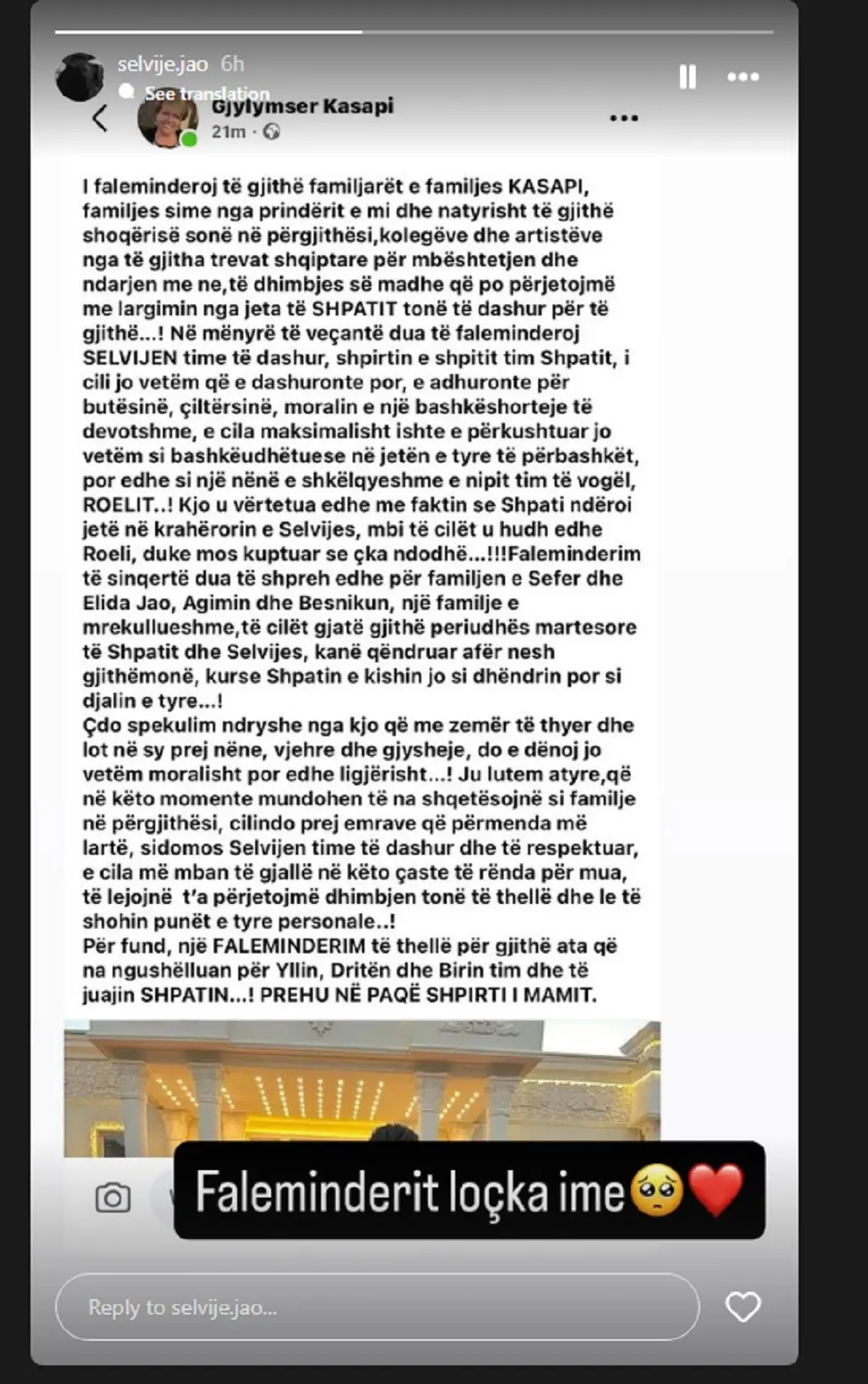 Gjithashtu, familja Kasapi shpreh falënderime të sinqerta për familjen Jao, të cilët gjatë gjithë viteve kanë qenë pranë Shpatit dhe Selvijes, duke e trajtuar artistin jo si dhëndër, por si djalin e tyre.