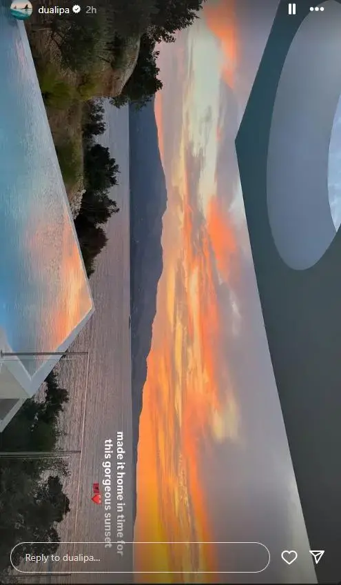 Në një postim të fundit në Instagram, Dua ndau një pamje mahnitëse të bregdetit shqiptar, ku perëndimi diellit ndriçon detin Jon me ngjyrat e tij mahnitëse.