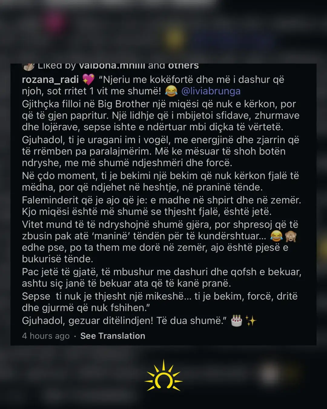 “Ti je uragani im i vogël, me energjinë dhe zjarrin që të rrëmben pa paralajmërim. Më ke mësuar të shoh botën ndryshe, me më shumë ndjeshmëri dhe forcë,” ka shkruar Rozana, duke shprehur dashurinë dhe mirënjohjen për Livin.