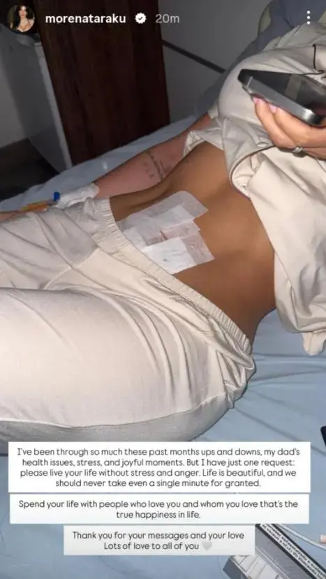 Fotografia tregon Morenën e shtrirë në spital, me një fashë rreth barkut dhe duke marrë infuzion. Kjo situatë natyrisht ka shkaktuar një valë shqetësimi mes miqve dhe fansave.