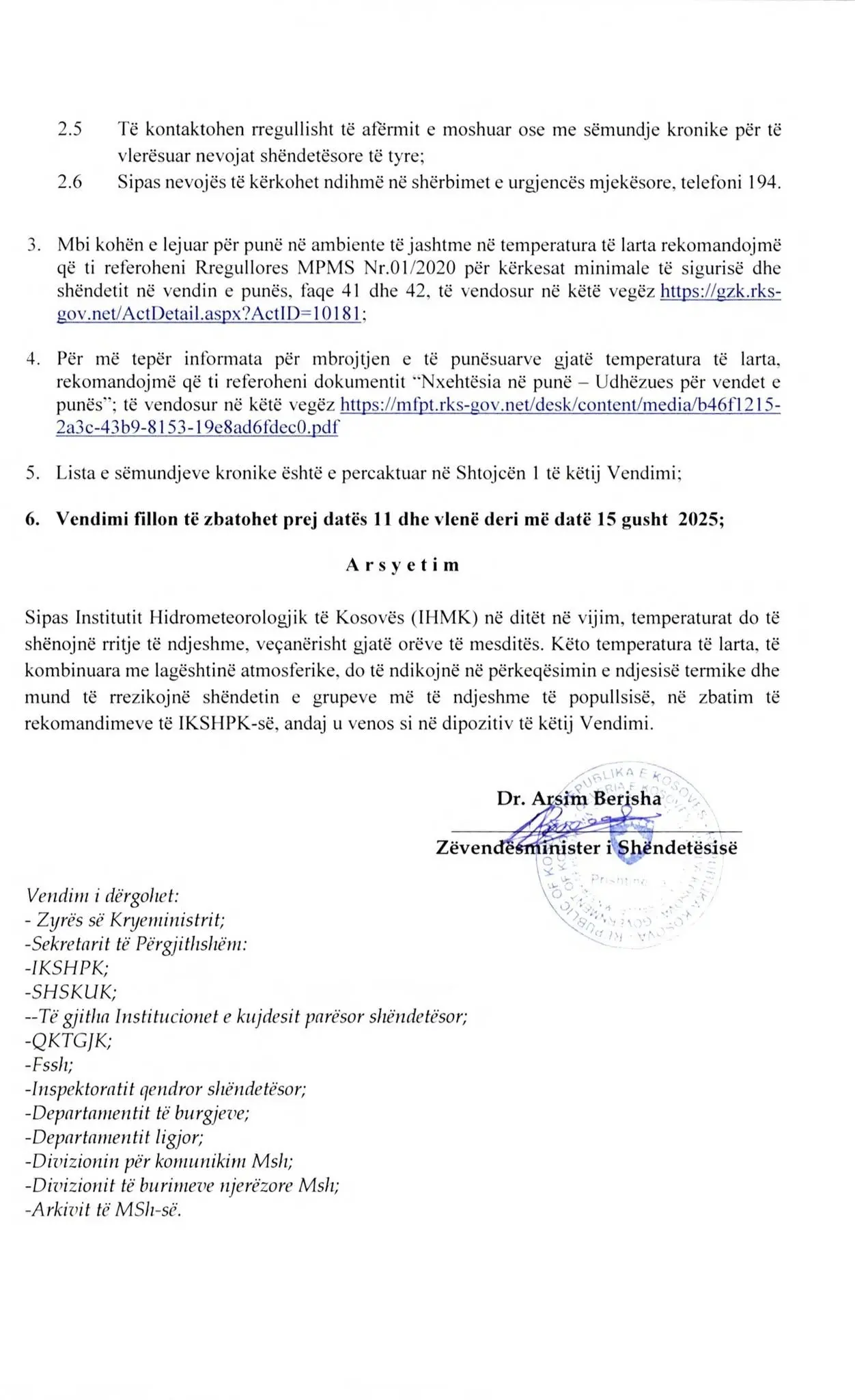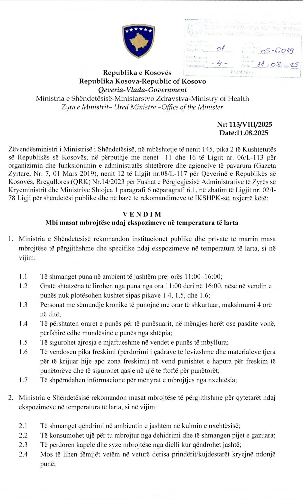 Ministria e Shëndetësisë ka rekomanduar që institucionet publike dhe private të zbatojnë masa mbrojtëse për punëtorët gjatë periudhës 11 – 15 gusht 2025. Këto masa janë të domosdoshme për të mbrojtur shëndetin e punëtorëve nga efektet negative të temperaturave të larta.