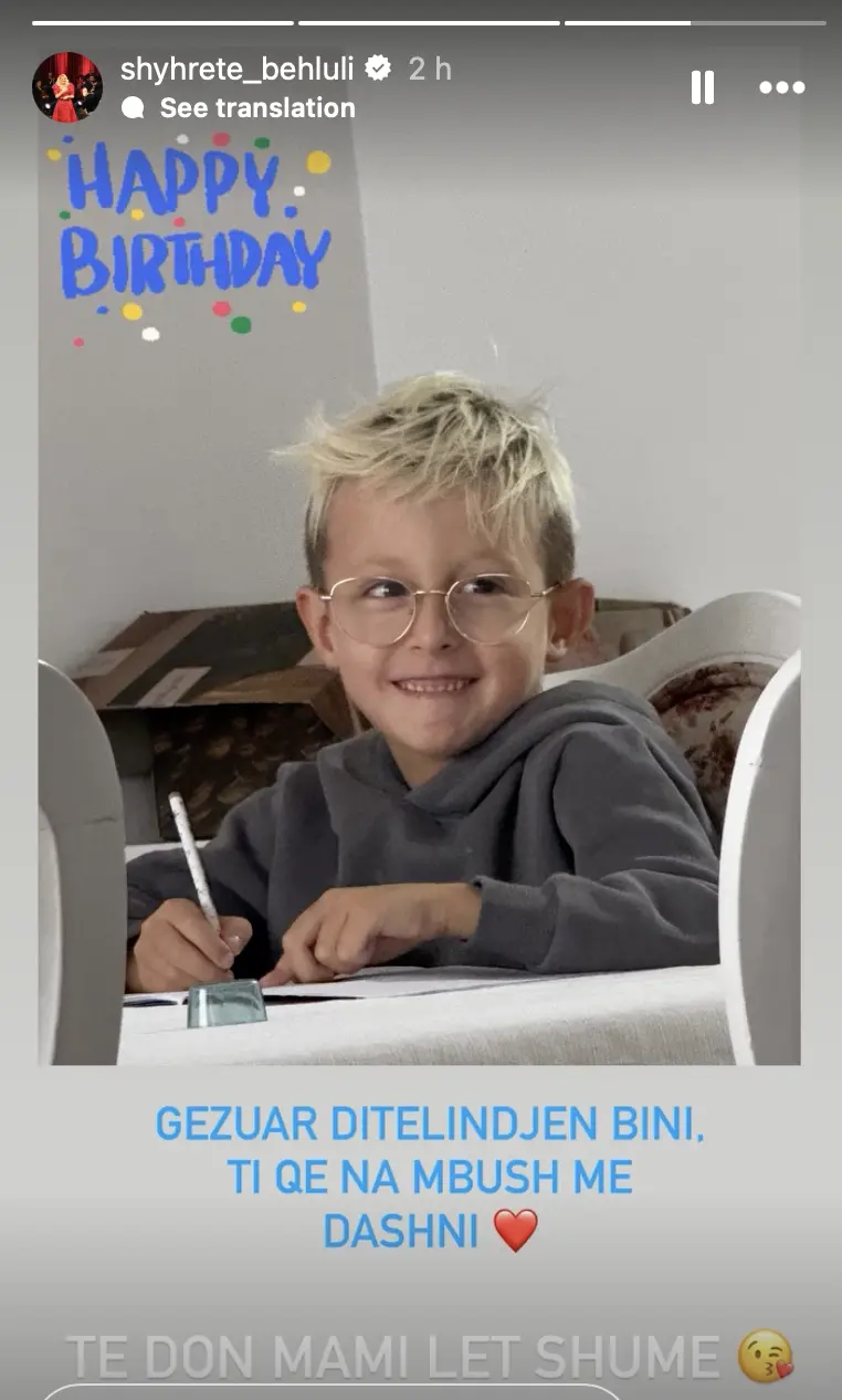 “Gëzuar ditëlindjen Bini, ti që na mbush me dashni,” ka shkruar Shyhreteja, duke e përmbyllur urimin me një emoji zemre që thekson emocionet e saj.