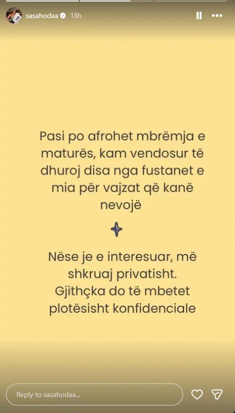 Në një postim të saj në Instastory, ajo shpalli: “Pasi po afrohet mbrëmja e maturës, kam vendosur të dhuroj disa nga fustanet e mia për vajzat që kanë nevojë.
