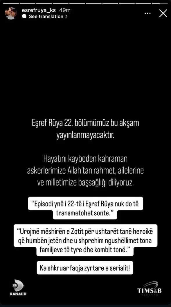 Seriali turk “Eşref Rüya” ka bërë një njoftim të papritur për fansat e tij, duke konfirmuar se episodi i ri i planifikuar për sonte nuk do të transmetohet.