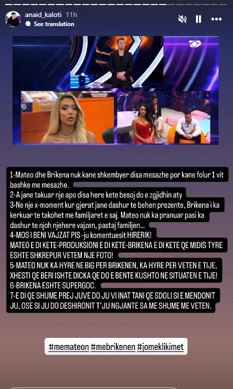 Anaid Kaloti, fitues i Big Brother 6, ka vendosur të sqarojë situatën përmes një postimi në Instagram, duke zbuluar detaje të rëndësishme rreth marrëdhënies mes Brikenës dhe Mateos jashtë shtëpisë. Ai ka theksuar se mesazhet e tyre kanë qenë të shumta, duke sugjeruar se ka pasur një investim emocional të ndërsjellë.