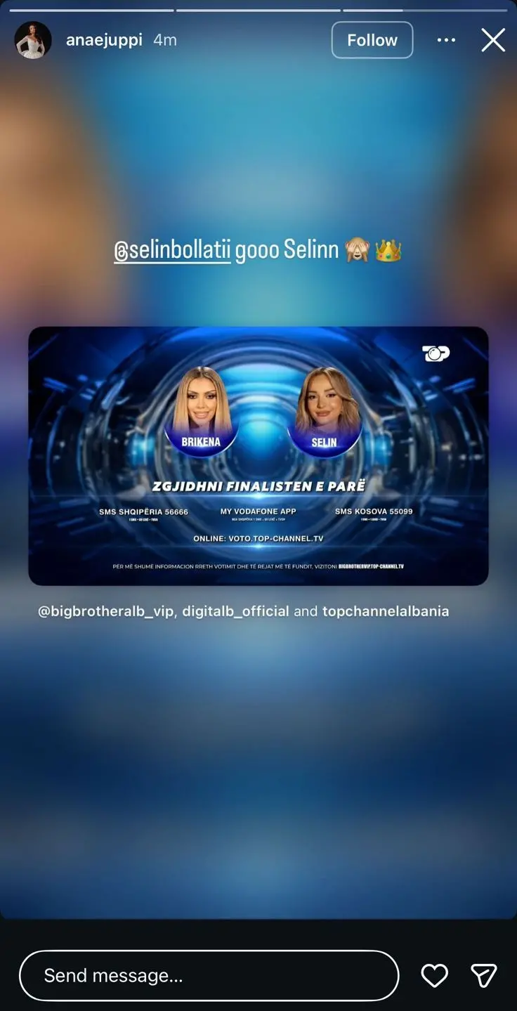 Me një postim të veçantë në Instagram, Ana ka shprehur mbështetje për Selin Bollatin. Kjo ka shkaktuar reagime të shumta nga ndjekësit e saj, të cilët janë të interesuar për të ditur se si do të ndikojë kjo mbështetje në votat e publikut.