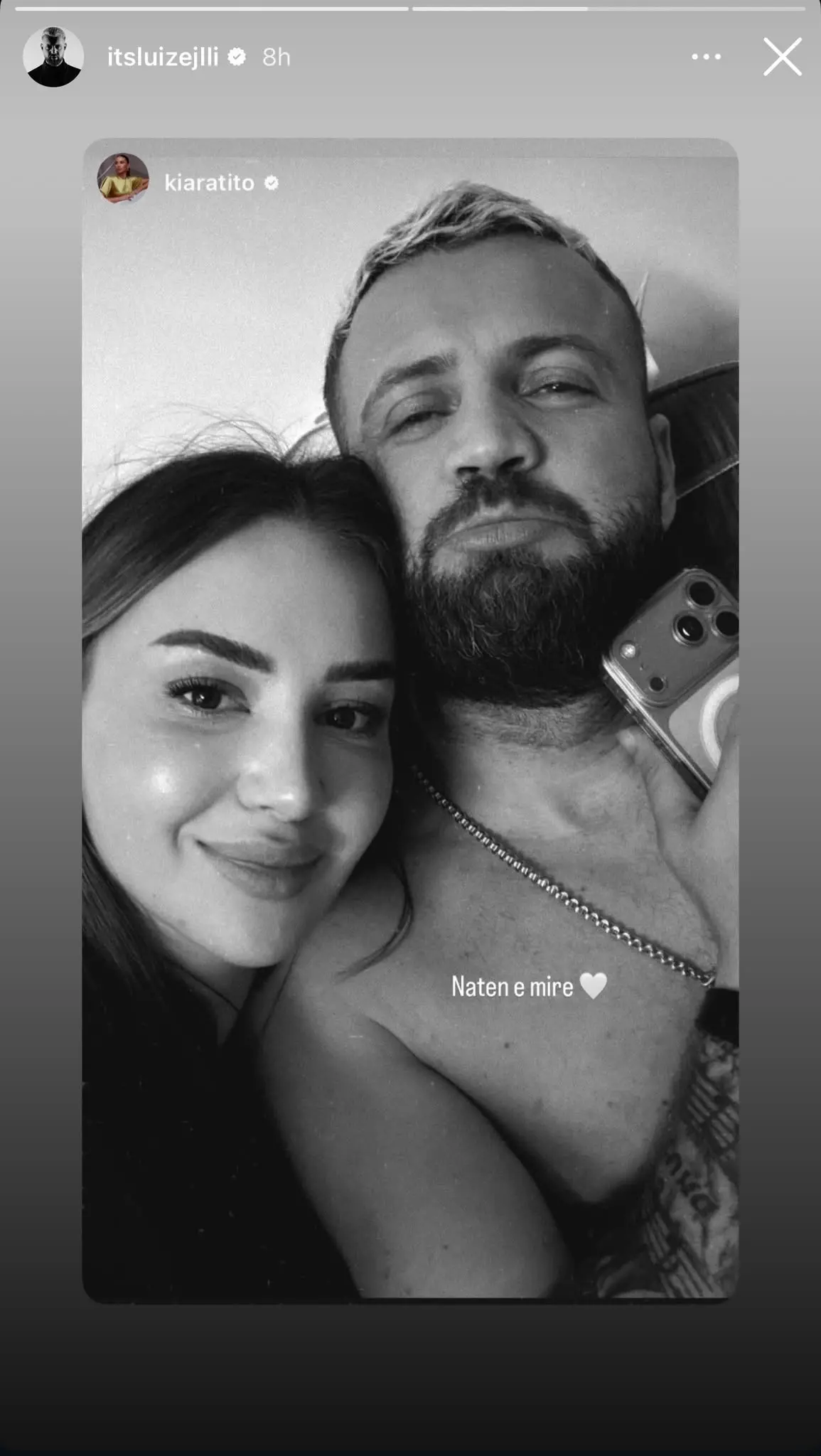 Në imazh, çifti shfaqet nga shtrati, ku Luizi shihet pa bluzë në pjesën e sipërme të trupit. Postimi është pjesë e momenteve të tyre private të ndara në rrjete sociale.