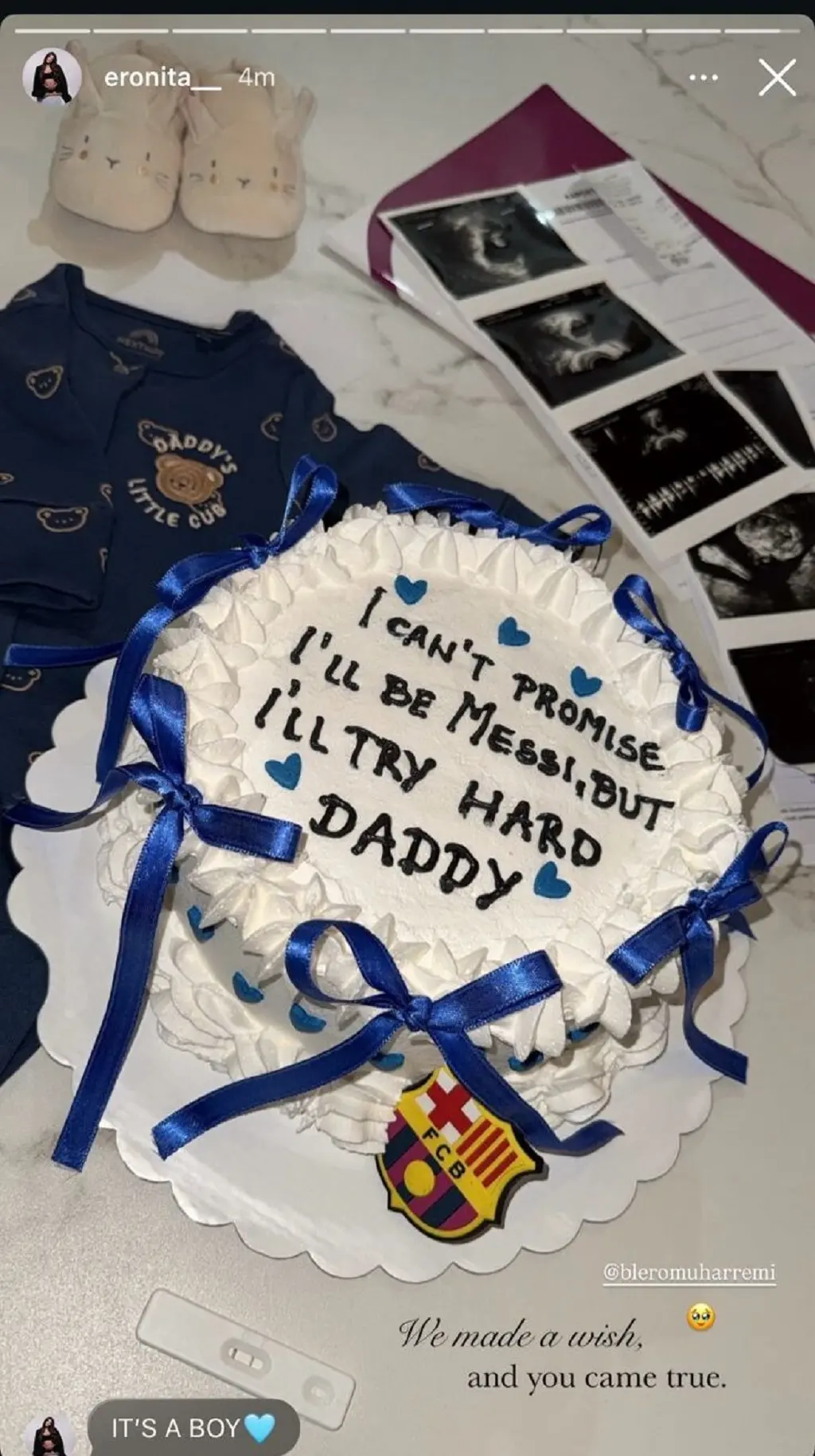 Në një fotografi tejet emocionuese të ndarë në Instastory nga Eronita, ajo çfarë ka rrëmbyer vëmendjen është një dedikim mjaft origjinal dhe me humor për Bleron. Në qendër të fotos qëndron një tortë e bardhë, e zbukuruar me kordele blu, zemra të vogla dhe si fans i madh Blero ndaj klubit spanjoll, është stema e skuadrës së Barcelonës.