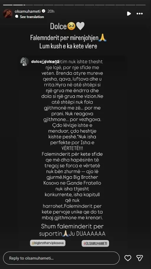 “Faleminderit për këtë përvojë unike që do ta mbaj gjithmonë me krenari. Shumë faleminderit për suportin, ju dua”, ka shkruar Dolce, duke e taguar Big Brother dhe Olsa Muhametin në postimin e saj, duke shfaqur mirënjohjen për këtë mundësi.